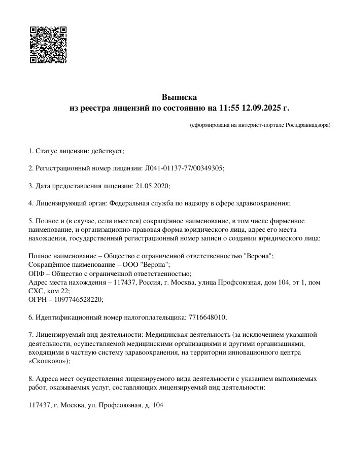 Cтоимость визита к врачу не всегда совпадает с указанной ценой приёма на сайте. Окончательная стоимость приема врача может включать стоимость дополнительных услуг. Необходимость оказания таких услуг определяется врачом клиники ООО "Верона" в зависимости от медицинских показаний непосредственно во время приёма.