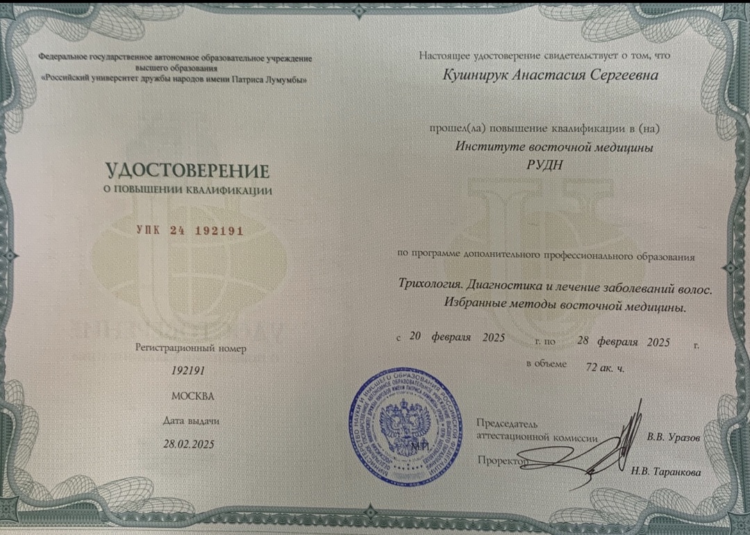 2025 год - "Трихология. Диагностика и лечение заболеваний волос. Избранные методы восточной медицины". Институт восточной медицины РУДН.