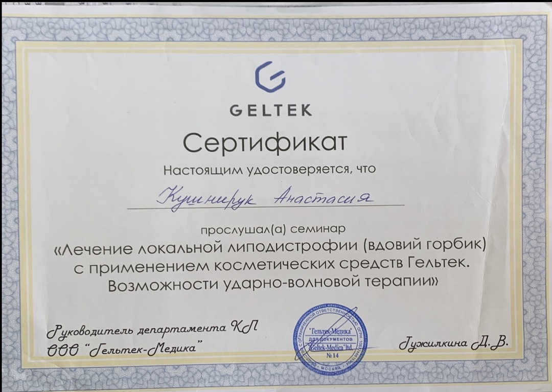 2025 год - Семинар «Лечение локальной липодистрофии (вдовий горбик) с применением косметических средств Гельтек. Возможности ударно-волновой терапии» (Учебный центр "Гельтек. Центр Диагностики Кожи").