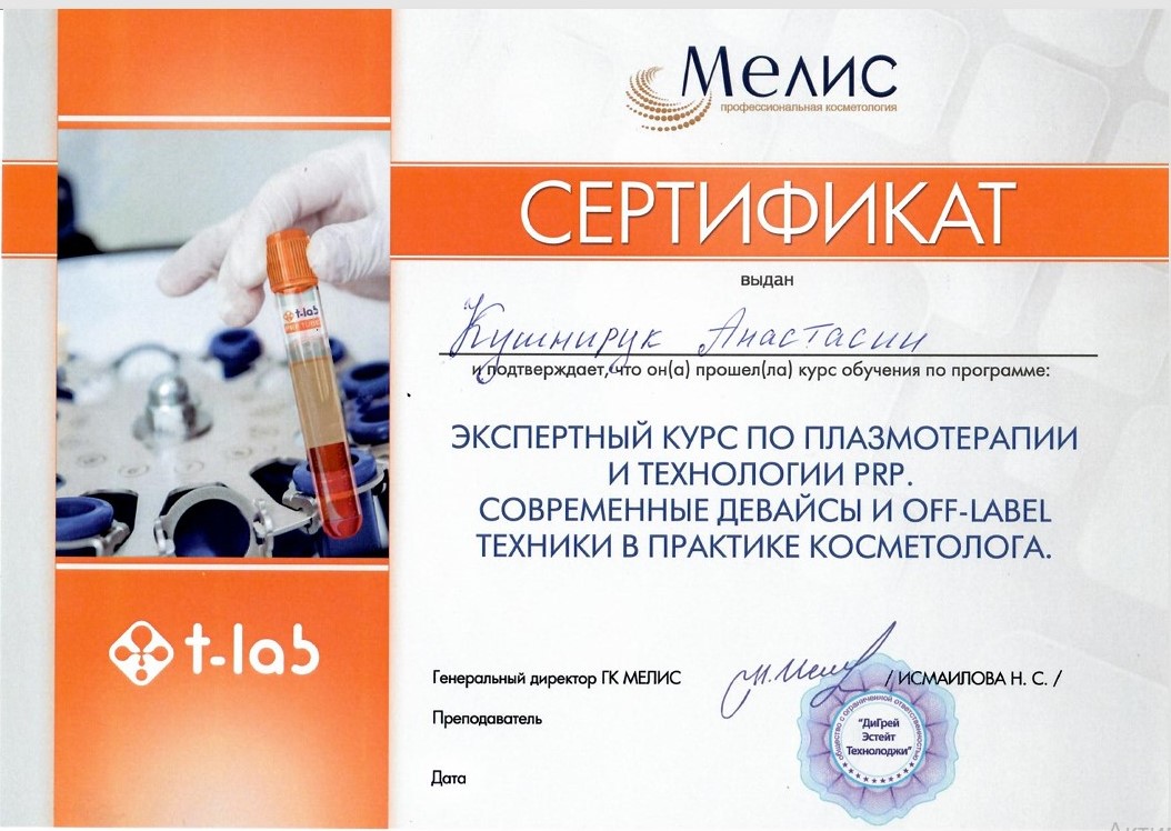 2025 год - "Экспертный курс по плазмотерапии и технологии PRP. Современные девайсы и OFF-LABEL техники в практике косметолога". Центр профессиональной косметологии МЕЛИС.