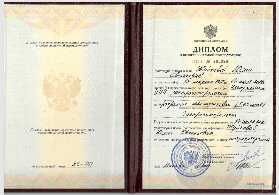 2012 г. - г. Москва, Центральный НИИ Гастроэнтерологии. Профессиональная переподготовка по специальности «Гастроэнтерология».