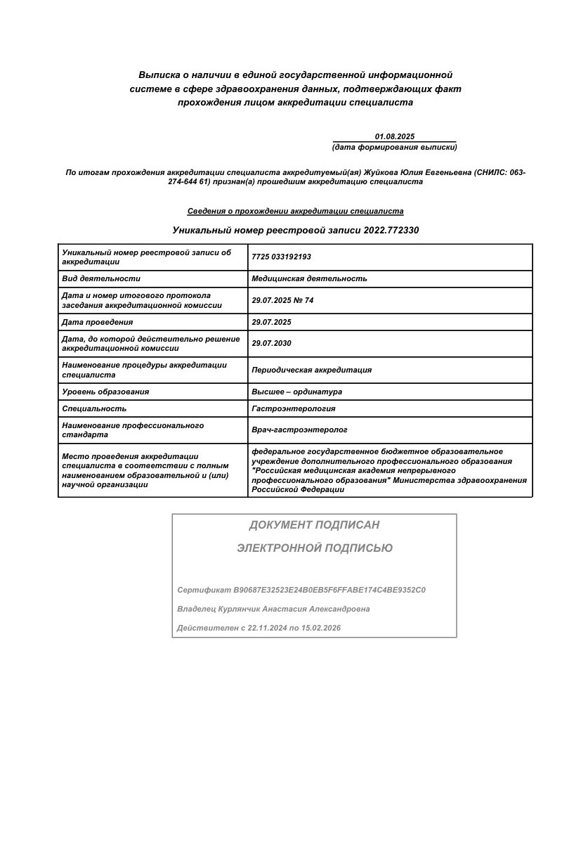 2020 г. - г. Москва, ООО «Межрегиональный институт подготовки кадров». Повышение квалификации по дополнительной профессиональной программе «Гастроэнтерология» (144 акад.ч.).