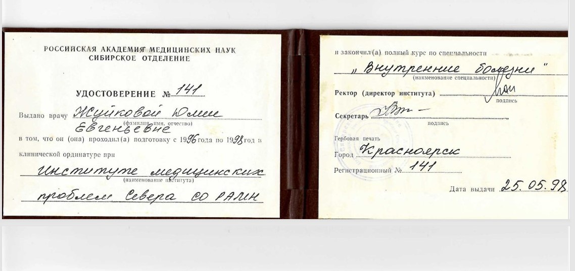 1996 - 1998 гг. - РАМН Институт медицинских проблем Севера. Ординатура по специальности «Внутренние болезни».