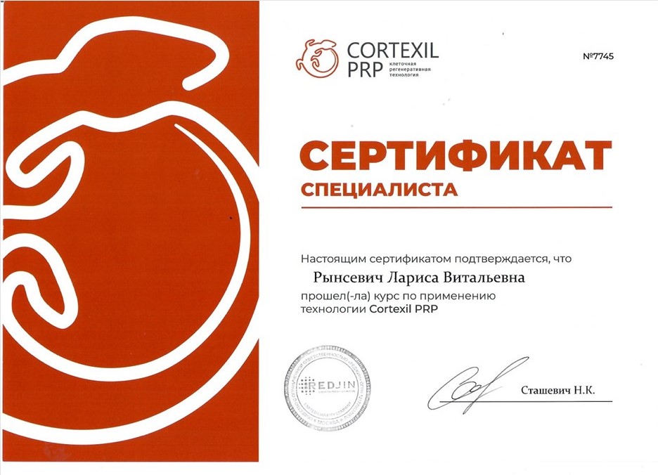 2025 г. - Прошла курс по применению технологии Cortexil PRP (клеточная регенеративная технология).