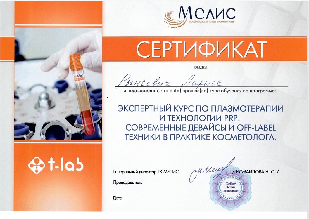 2025 г. - Прошла обучение по программе "Экспертный курс по плазмотерапии и технологии PRP. Современные девайсы и OFF-LABEL техники в практике косметолога" (на базе центра профессиональной косметологии МЕЛИС, 2025 г.).