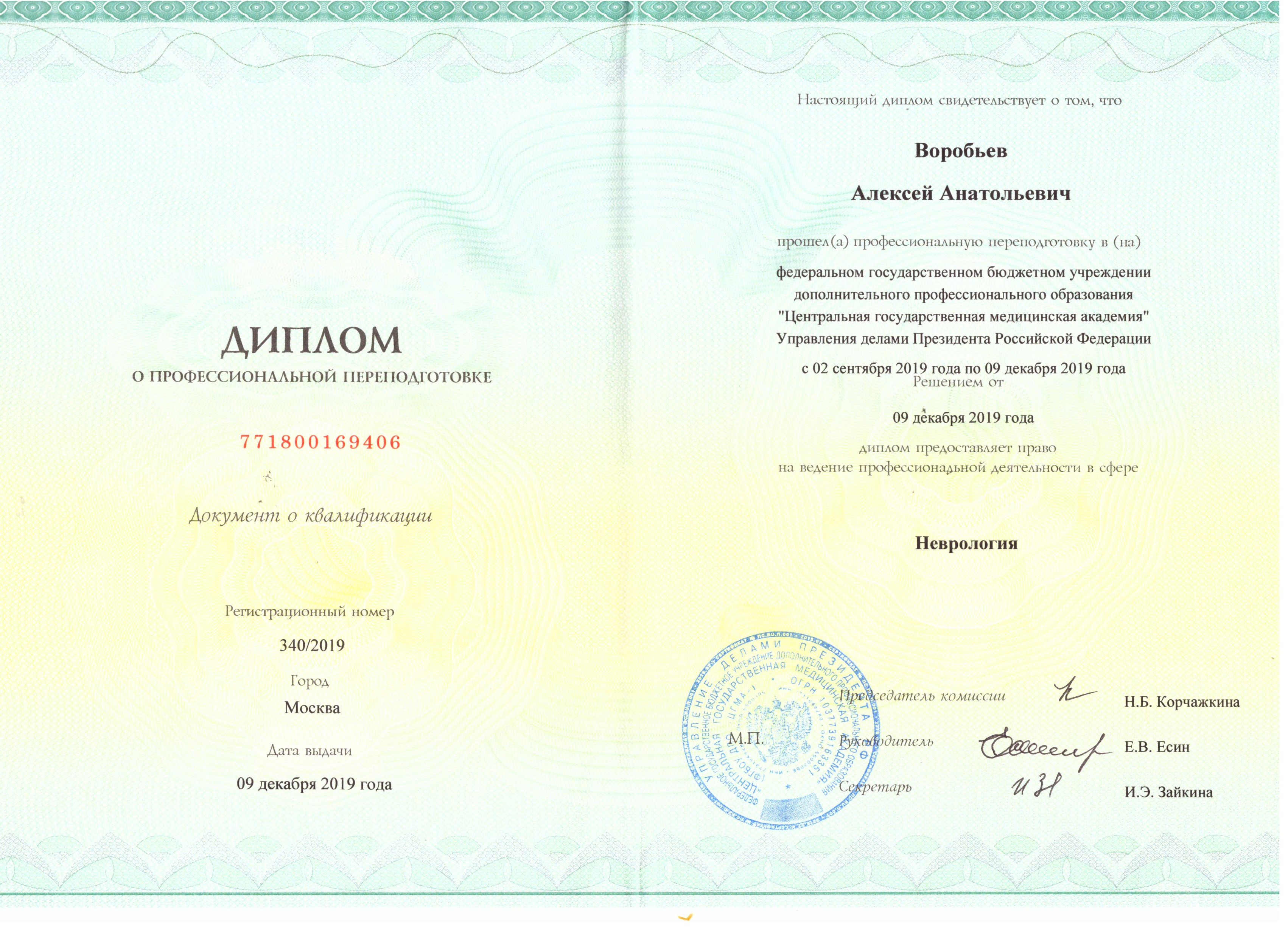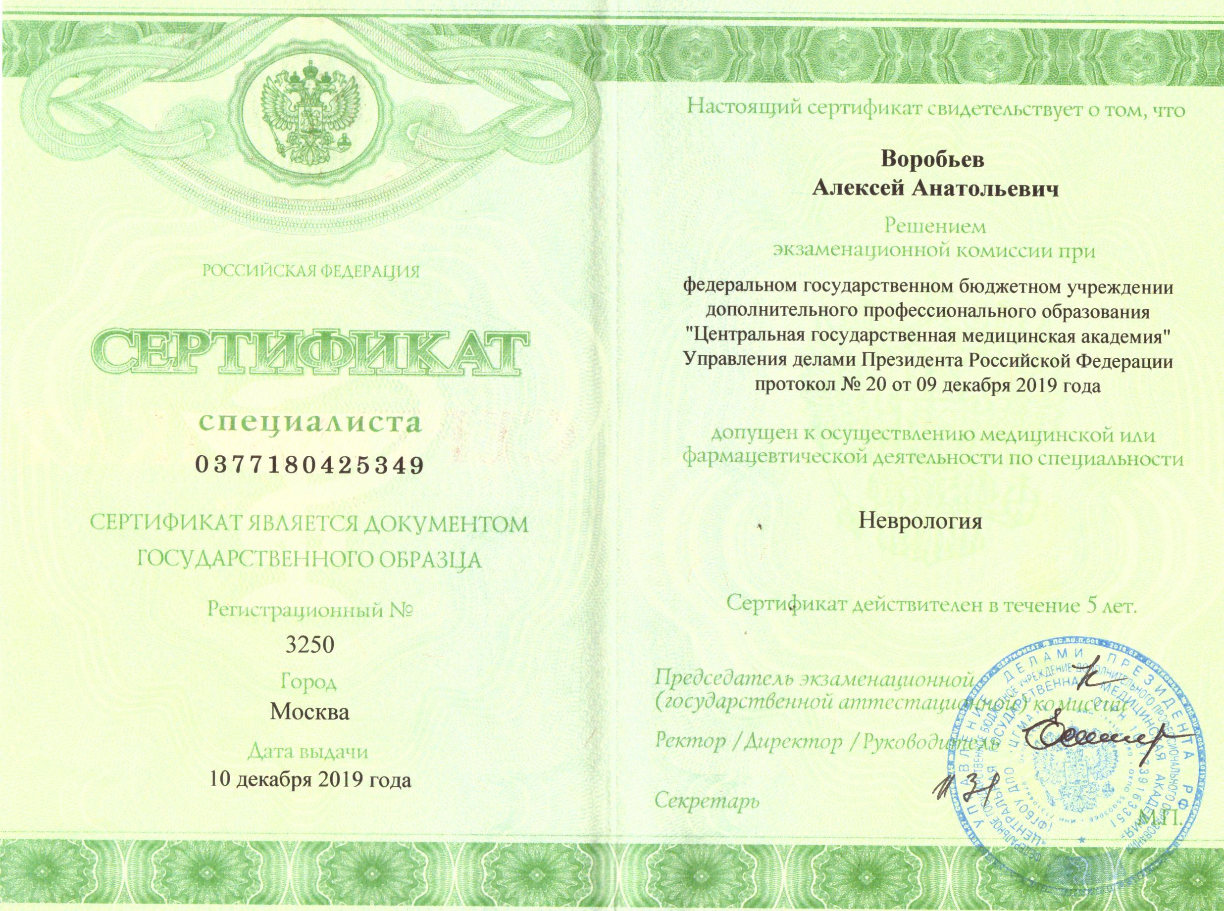 2019г. - Центральная государственная медицинская академия Управления делами Президента РФ, г.Москва, «Неврология».