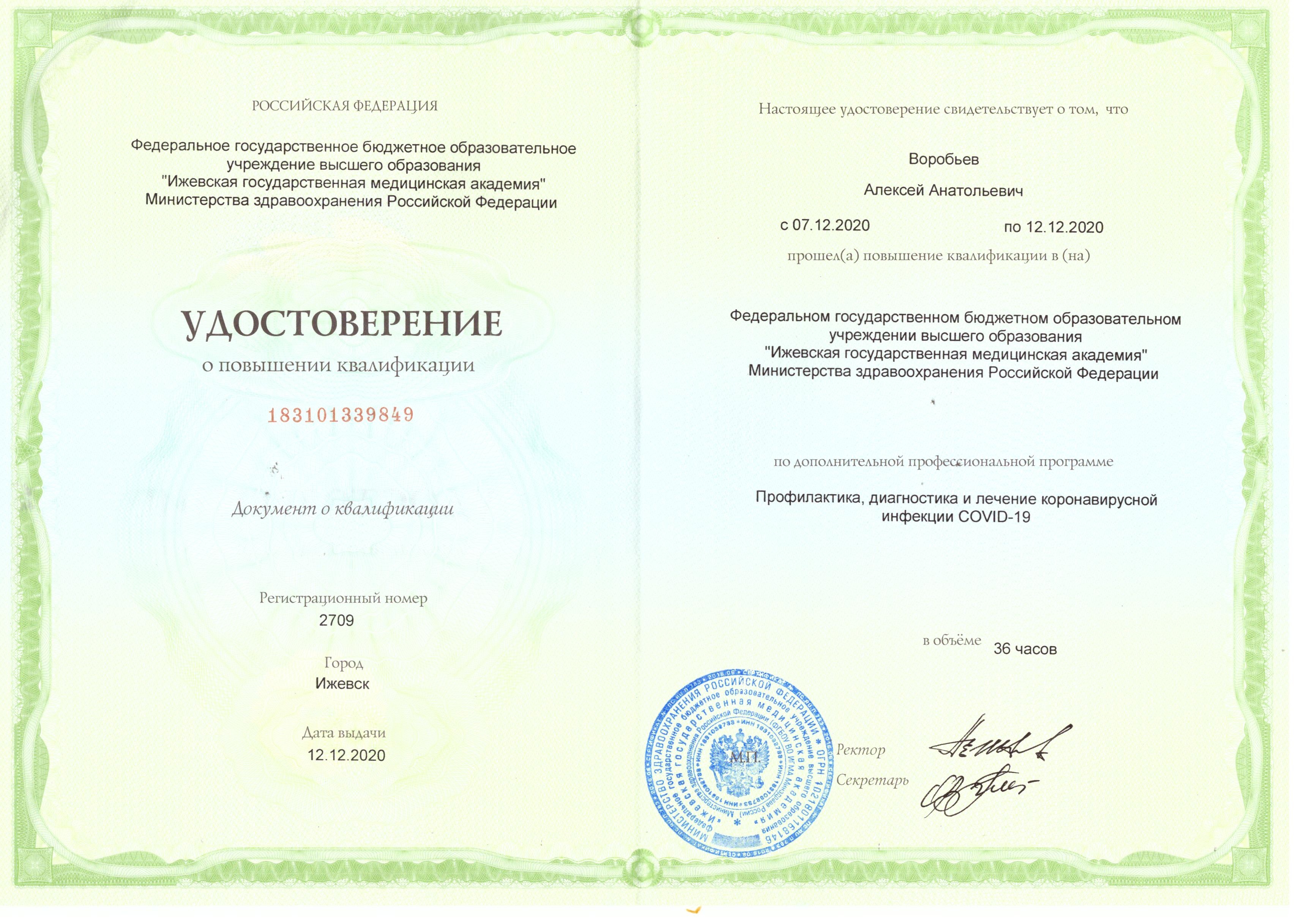 2020г. - Ижевская государственная медицинская академия, «Профилактика, диагностика и лечение короновирусной инфекции COVID-19».