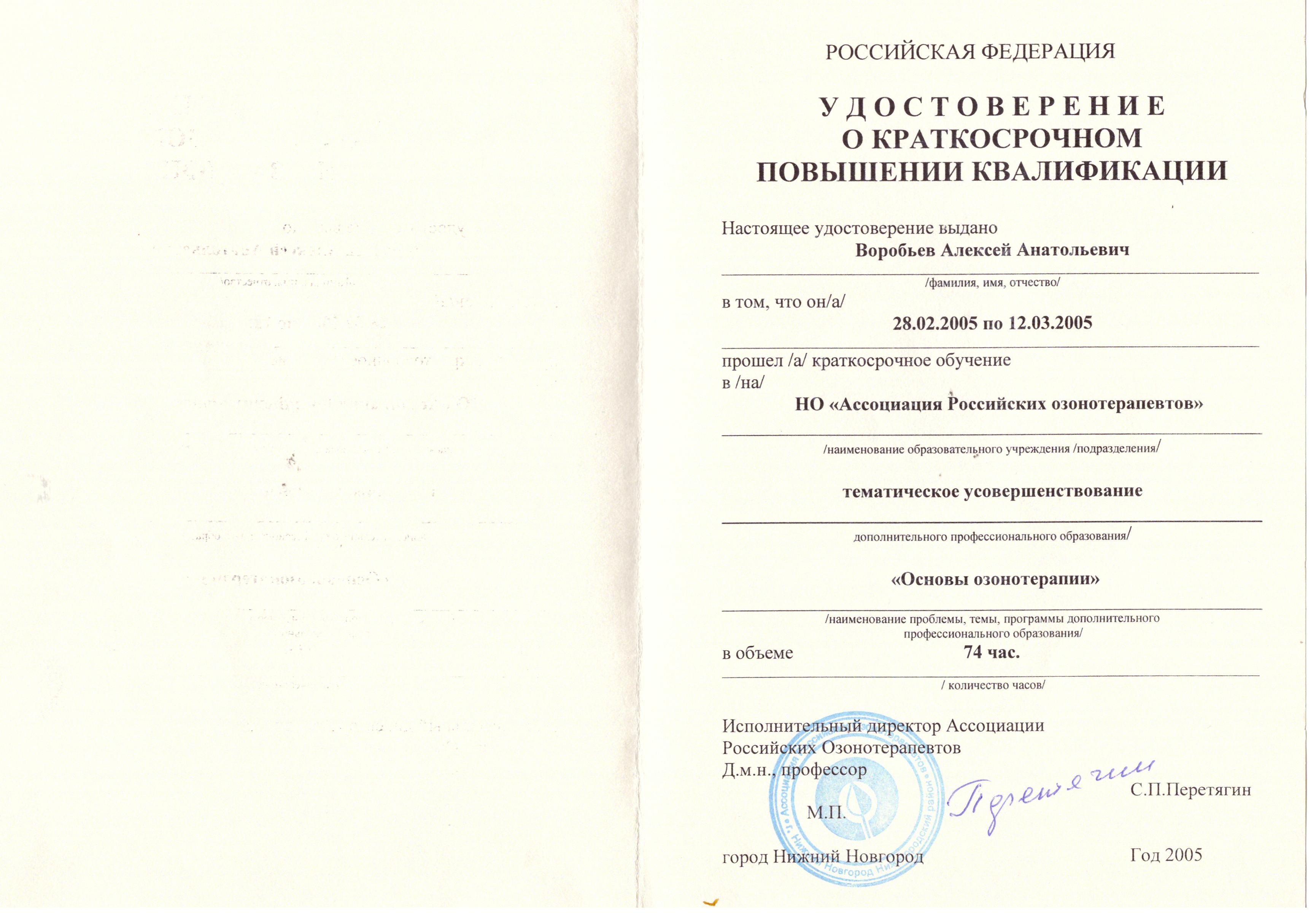 2005г. - НО «Ассоциация Российских озонотерапевтов», г.Нижний Новгород, «Основы озонотерапии».