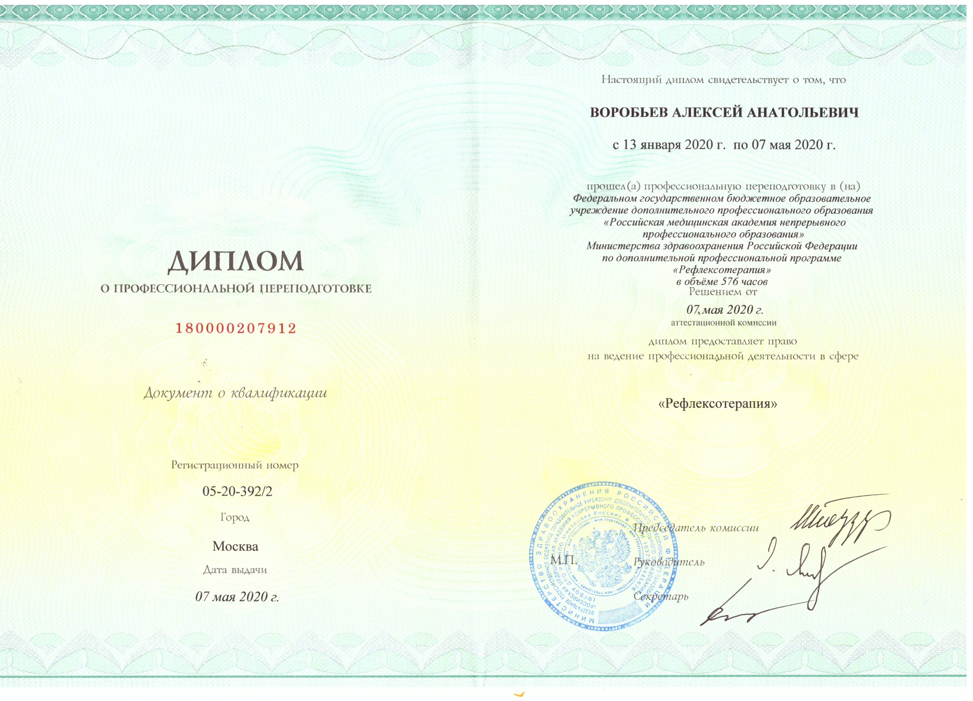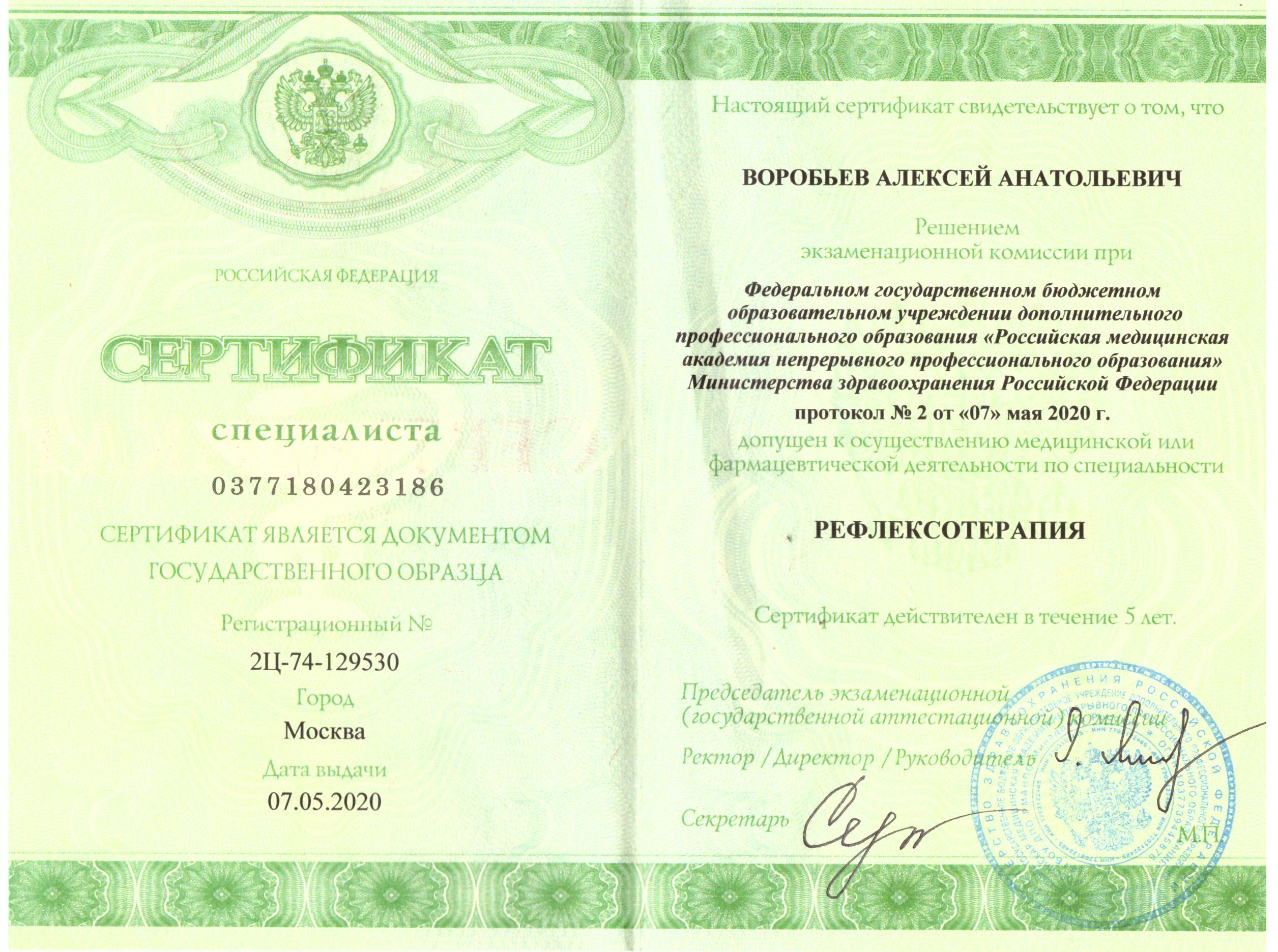 2020г. - Российская медицинская академия непрерывного медицинского образования МЗ РФ, г.Москва, «Рефлексотерапия».