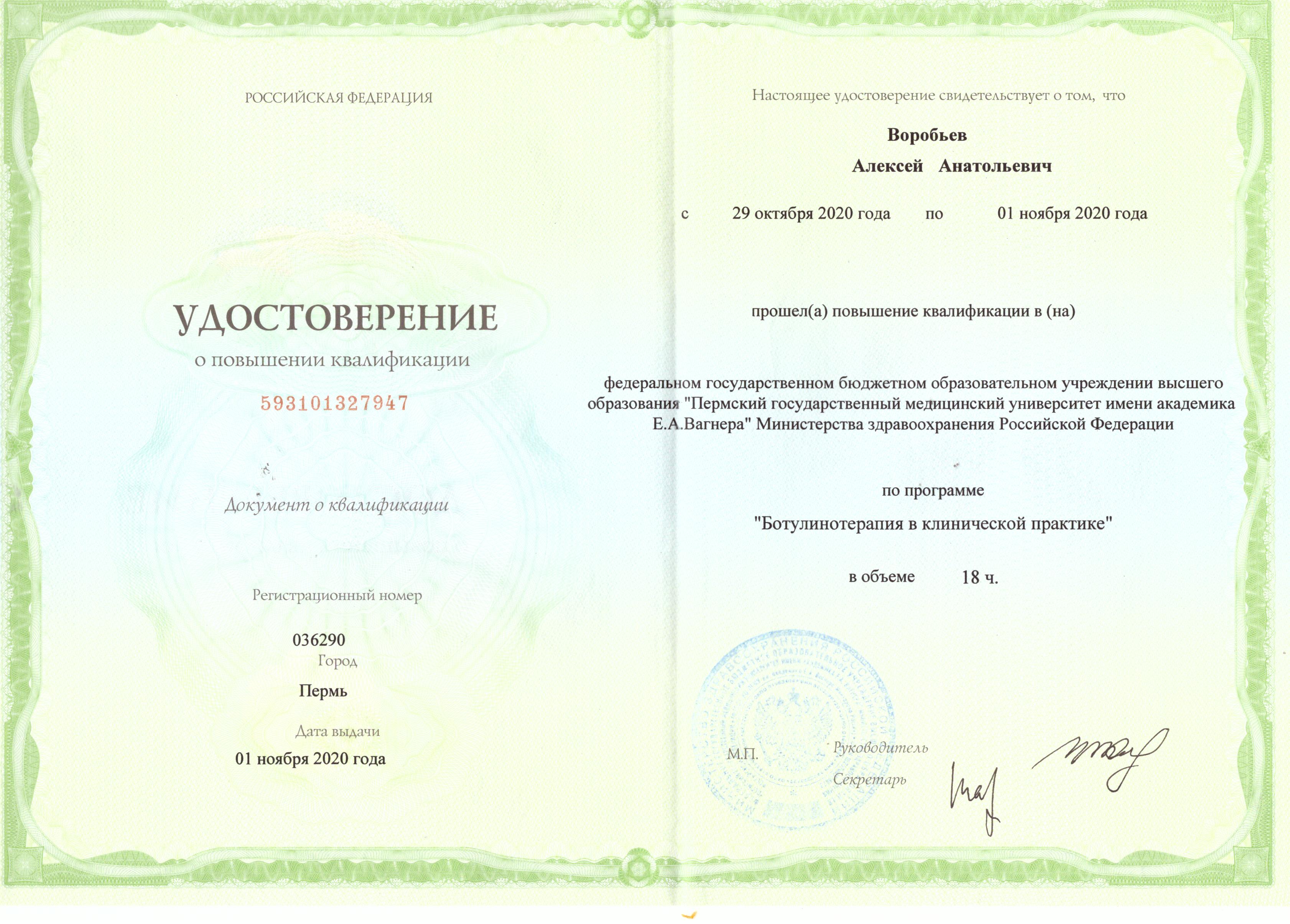 2020г. - Пермский государственный медицинский университет им. Е.А. Вагнера МЗ РФ, г.Пермь, «Ботулинотерапия в клинической практике».