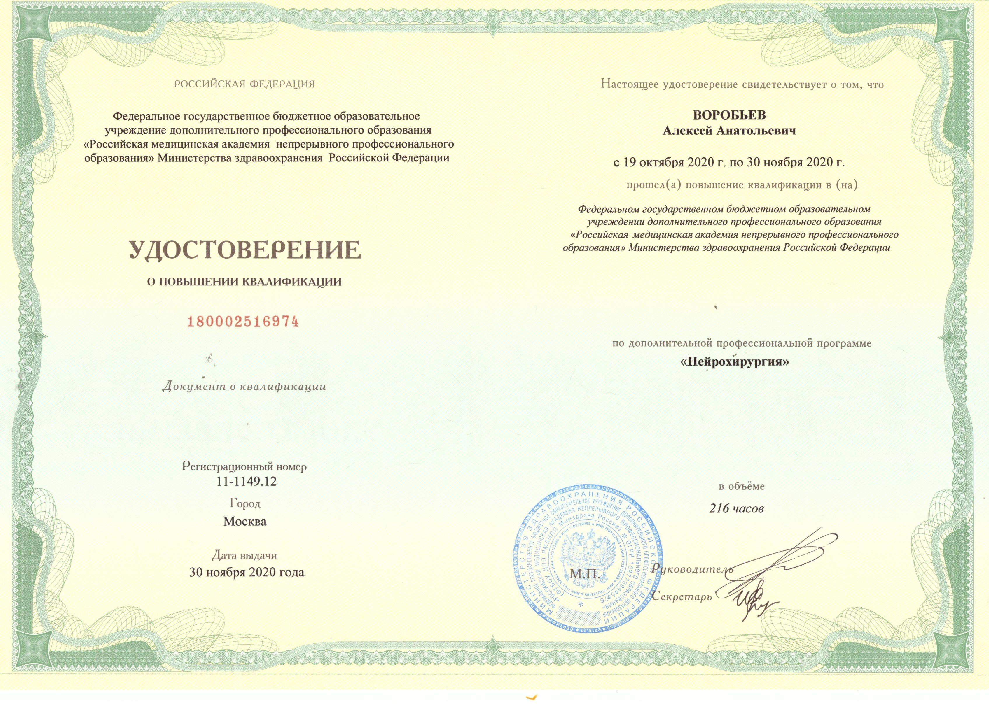 2020г. - Российская медицинская академия непрерывного медицинского образования МЗ РФ, г.Москва, «Нейрохирургия».