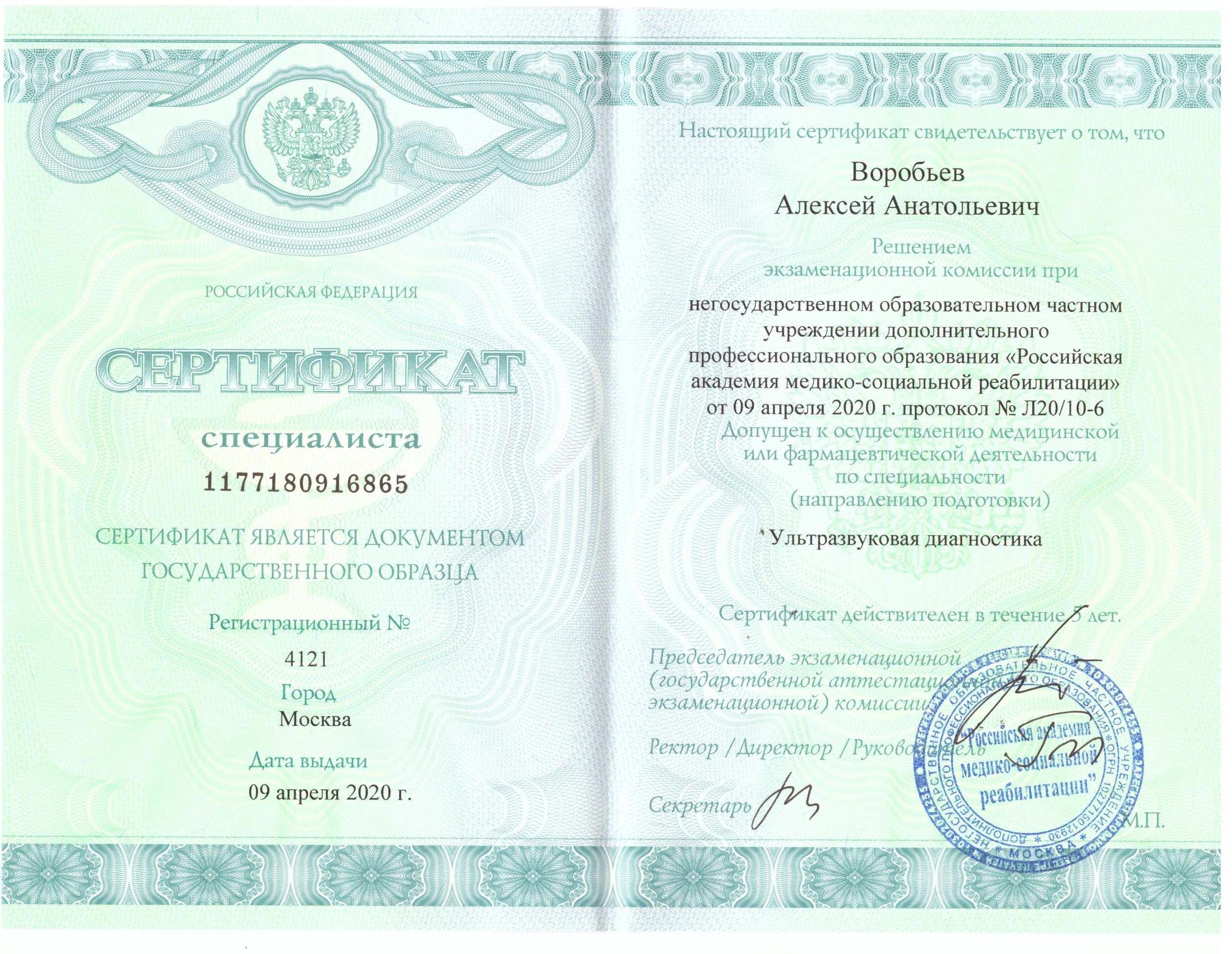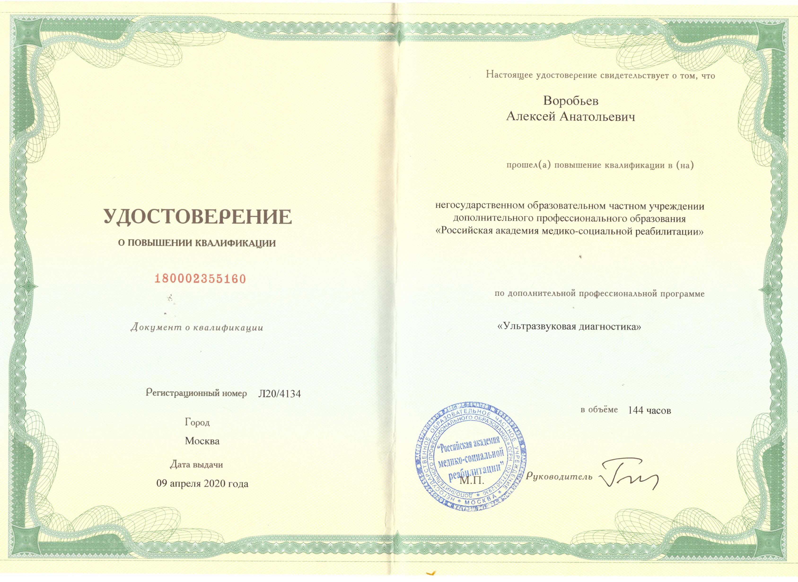 2020г. - Российская академия медико-социальной реабилитации, г.Москва, «Ультразвуковая диагностика».
