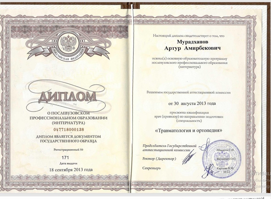2013г. - окончил МГМСУ им. А.И. Евдокимова по специальности Травматология и ортопедия.