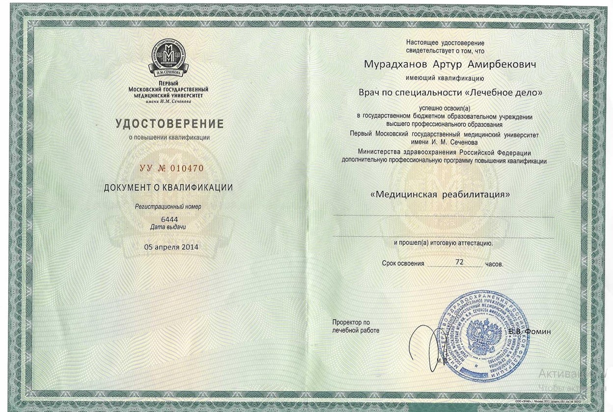 2014г. - прошёл курсы повышения квалификации в МГМУ им. И.М. Сеченова по специальности Медицинская реабилитация пациентов.