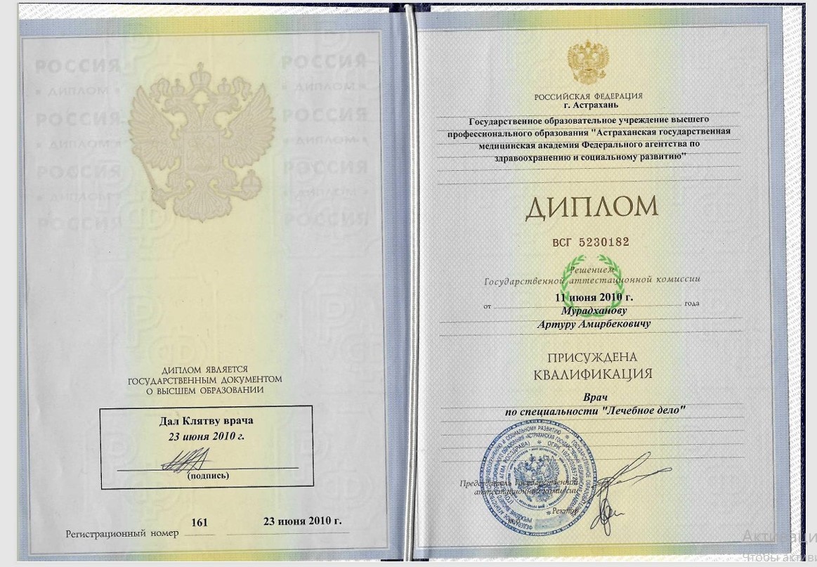 2010г. - окончил Астраханскую государственную медицинскую академию по специальности Лечебное дело.