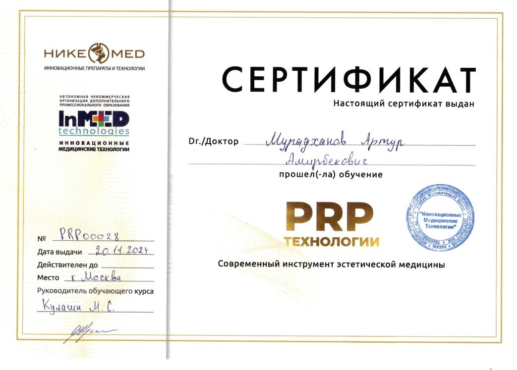 2024 г. - прошёл обучение: "PRP-технологии. Современный инструмент эстетической медицины" (Автономная некоммерческая организация дополнительного профессионального образования InMED technologies).